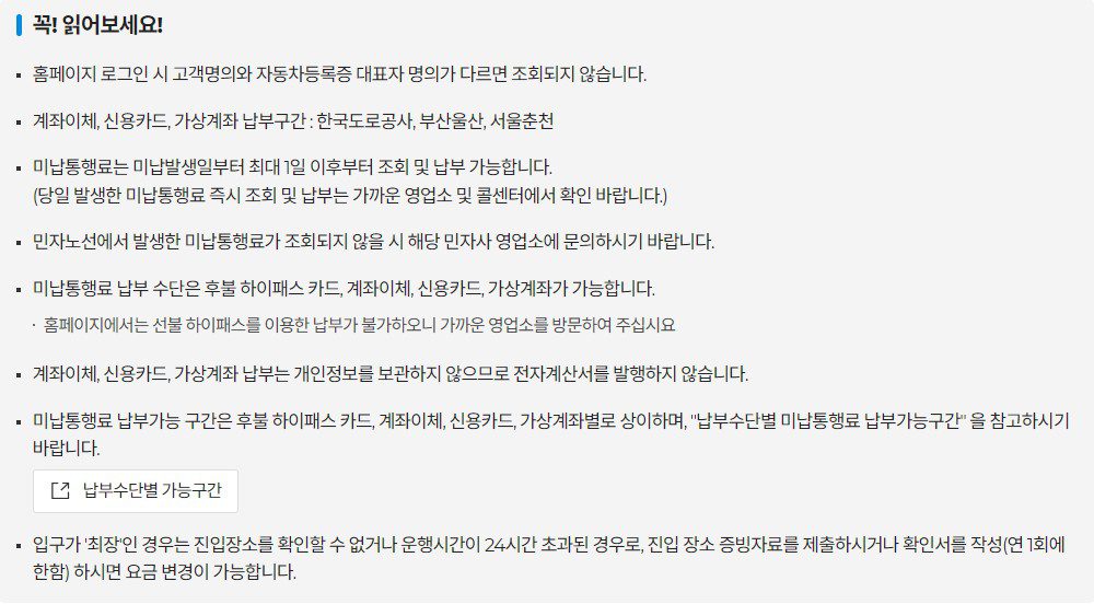 - 영업소에서 사무실이나 요금소 조회 후 현금/카드 결제 가능.